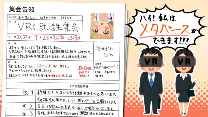 今回はVRChatで開催される「VRC就活生集会」というイベントをご紹介します。 VR内に就活生が集う! イベント内容 VR内で気軽に交流・情報交換ができる「VRC就活生集会」がVRChatにて開催されます。 https://twitter.com/ebtf_/status/1479748461402624001 ... -