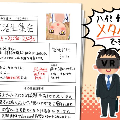 今回はVRChatで開催される「VRC就活生集会」というイベントをご紹介します。 VR内に就活生が集う! イベント内容 VR内で気軽に交流・情報交換ができる「VRC就活生集会」がVRChatにて開催されます。https://twitter.com/ebtf_/status/147974...